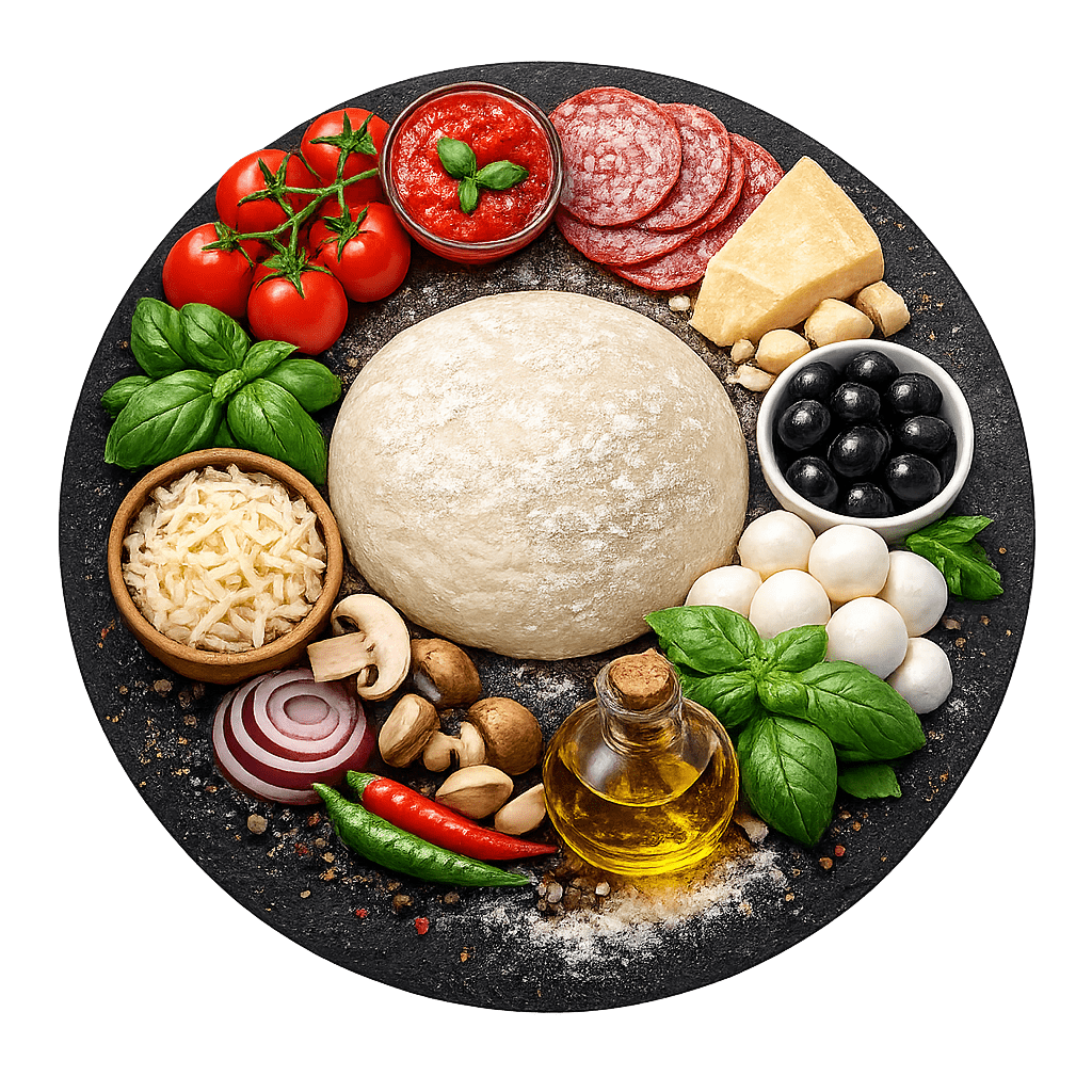 A round transparent image featuring fresh pizza ingredients arranged in a neat circular composition. Bright tomatoes, basil leaves, mozzarella, olives, and dough create a vibrant and natural presentation perfect for food branding or menus.
