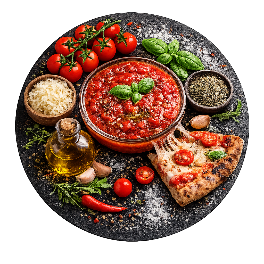 A circular transparent image centered on a bowl of rich, homemade pizza sauce. Surrounded by fresh herbs, garlic, tomatoes, and spices, it delivers an authentic and flavorful look.