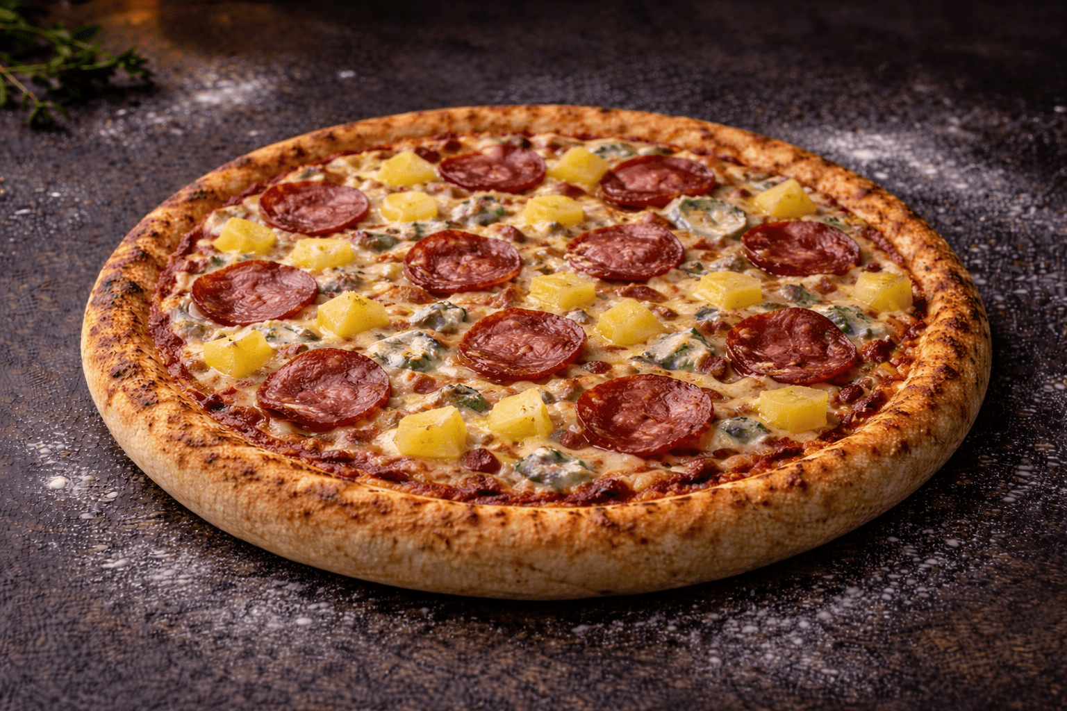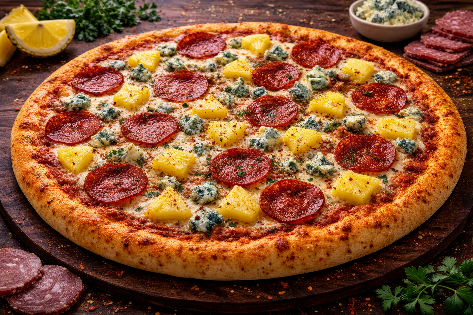 A delicious house-style pizza topped with salami, pineapple, and blue cheese. The strong and creamy blue cheese blends with the sweetness of pineapple and the savory salami. Together with tomato sauce and melted cheese, this pizza creates a bold and unique flavor combination.