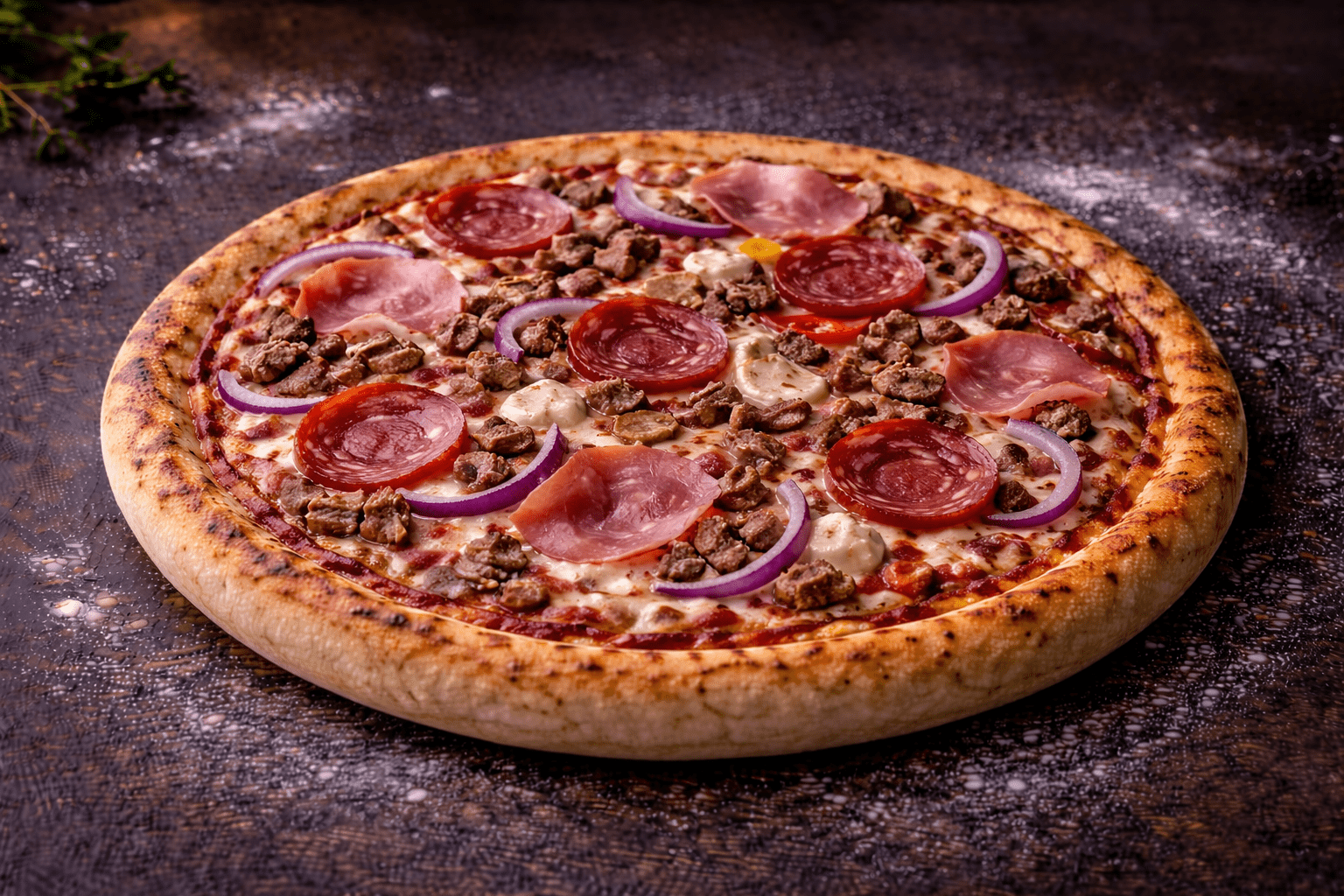 A hearty pizza loaded with ham, salami, minced meat, and onions. The mix of meats creates a rich and savory flavor while onions add sweetness and texture. This pizza is perfect for those who love a filling and meaty meal.