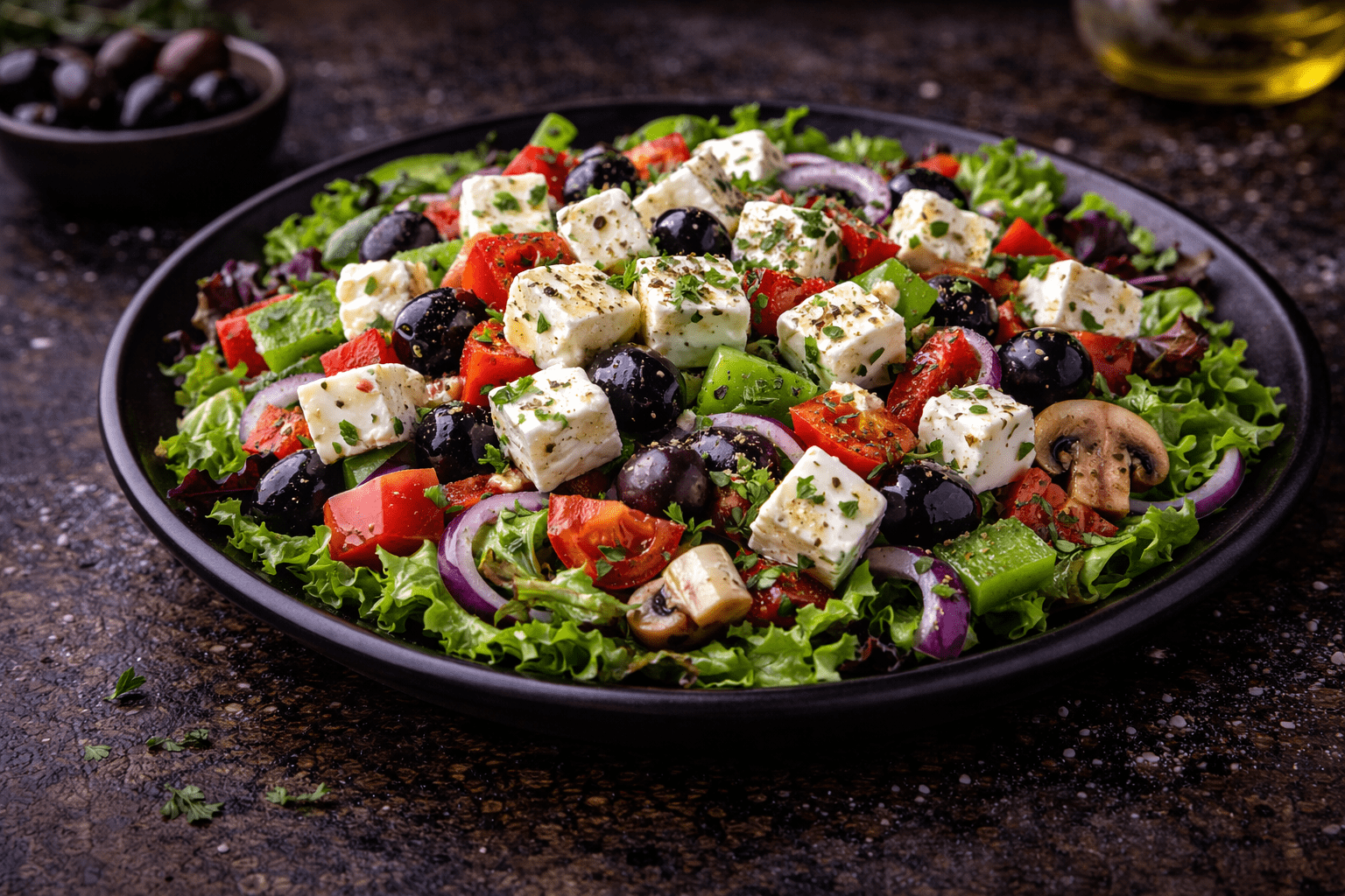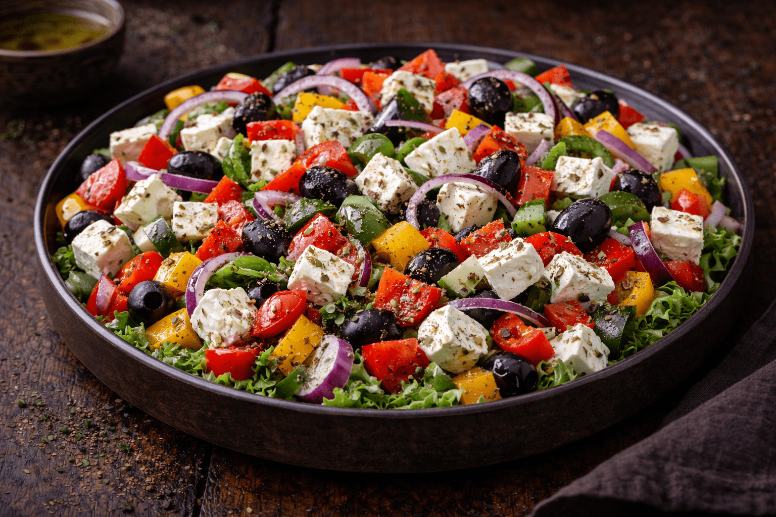 A Mediterranean-inspired salad featuring creamy feta cheese, fresh paprika, olives, and onions. The salty feta blends beautifully with the crisp vegetables and olives, creating a refreshing and flavorful dish. Light, colorful, and satisfying, this salad is perfect as a healthy meal or a tasty side dish.