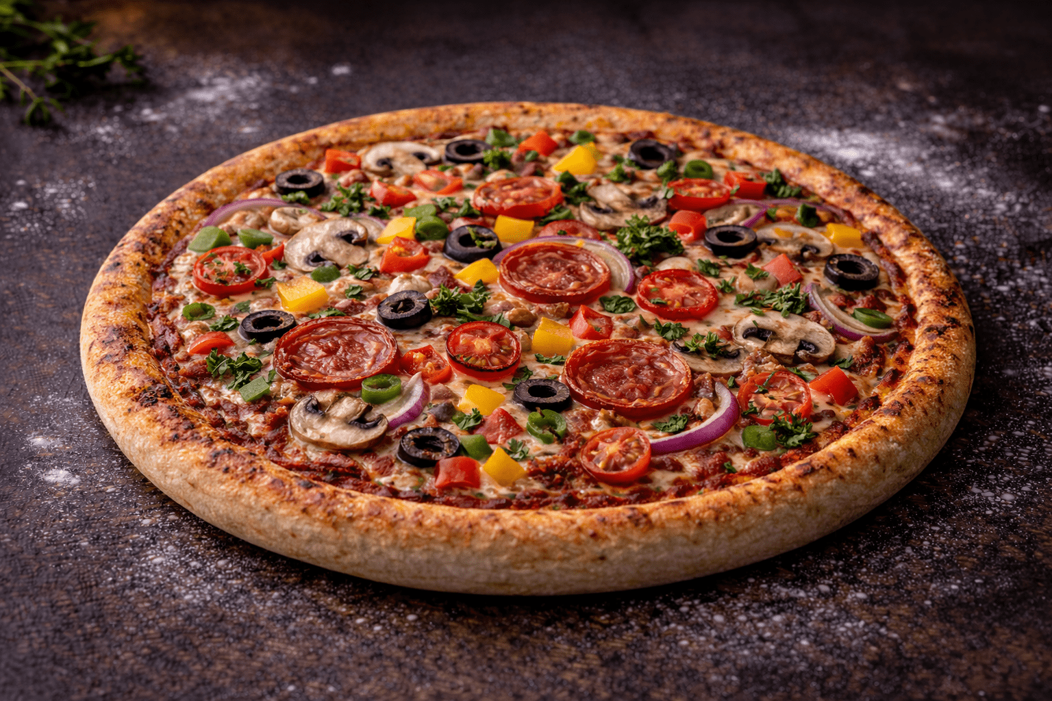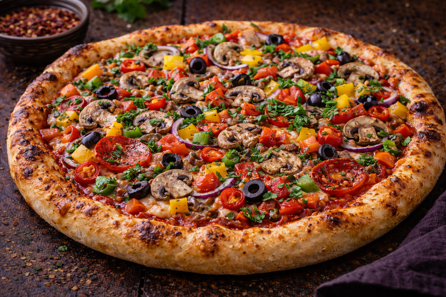 A fresh vegetable pizza featuring mushrooms, paprika, onions, tomatoes, parsley, and olives. The colorful mix of vegetables provides natural flavors and freshness. Combined with tomato sauce and melted cheese, this pizza is a perfect vegetarian option.
