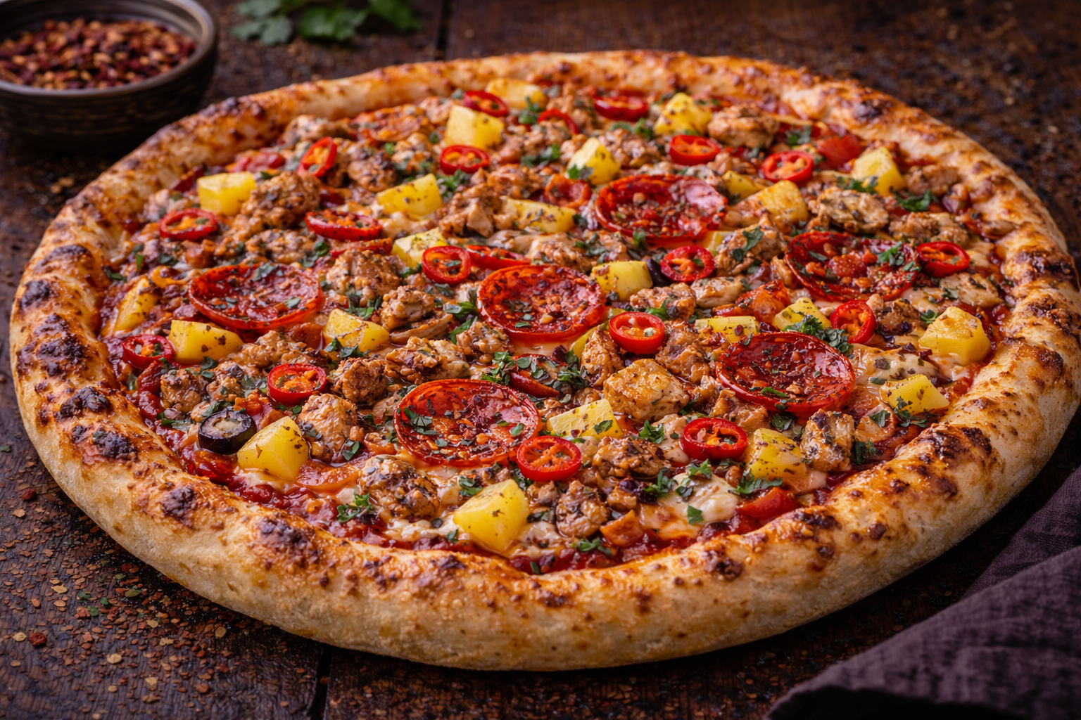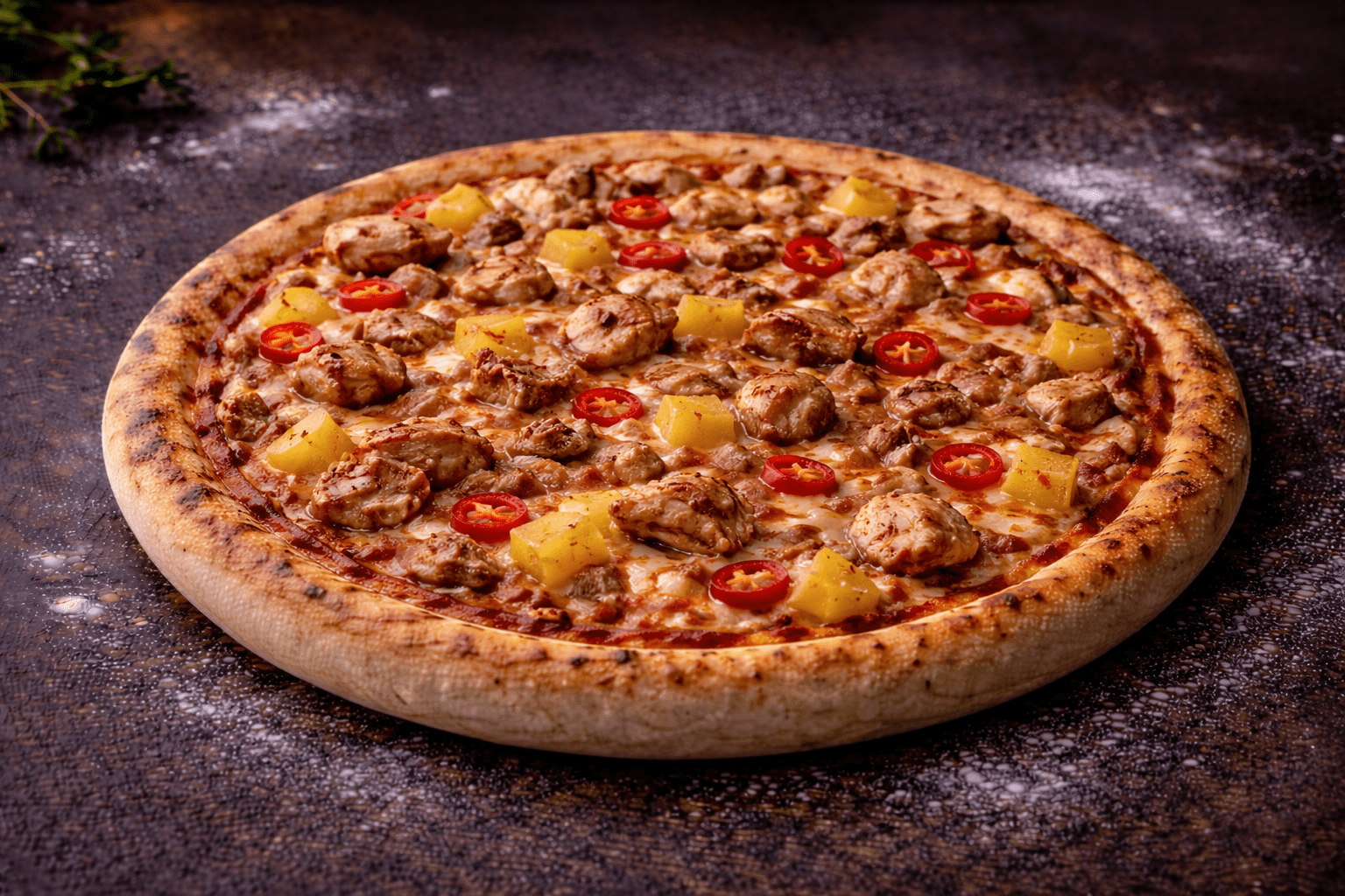 A spicy chicken pizza topped with taco sauce, chicken, pineapple, and chili. The sweet pineapple balances the heat of the chili, creating a flavorful and exciting combination. Perfect for those who enjoy spicy and sweet pizza flavors.