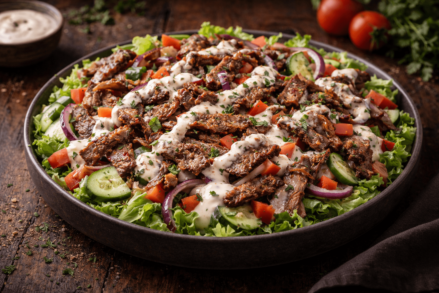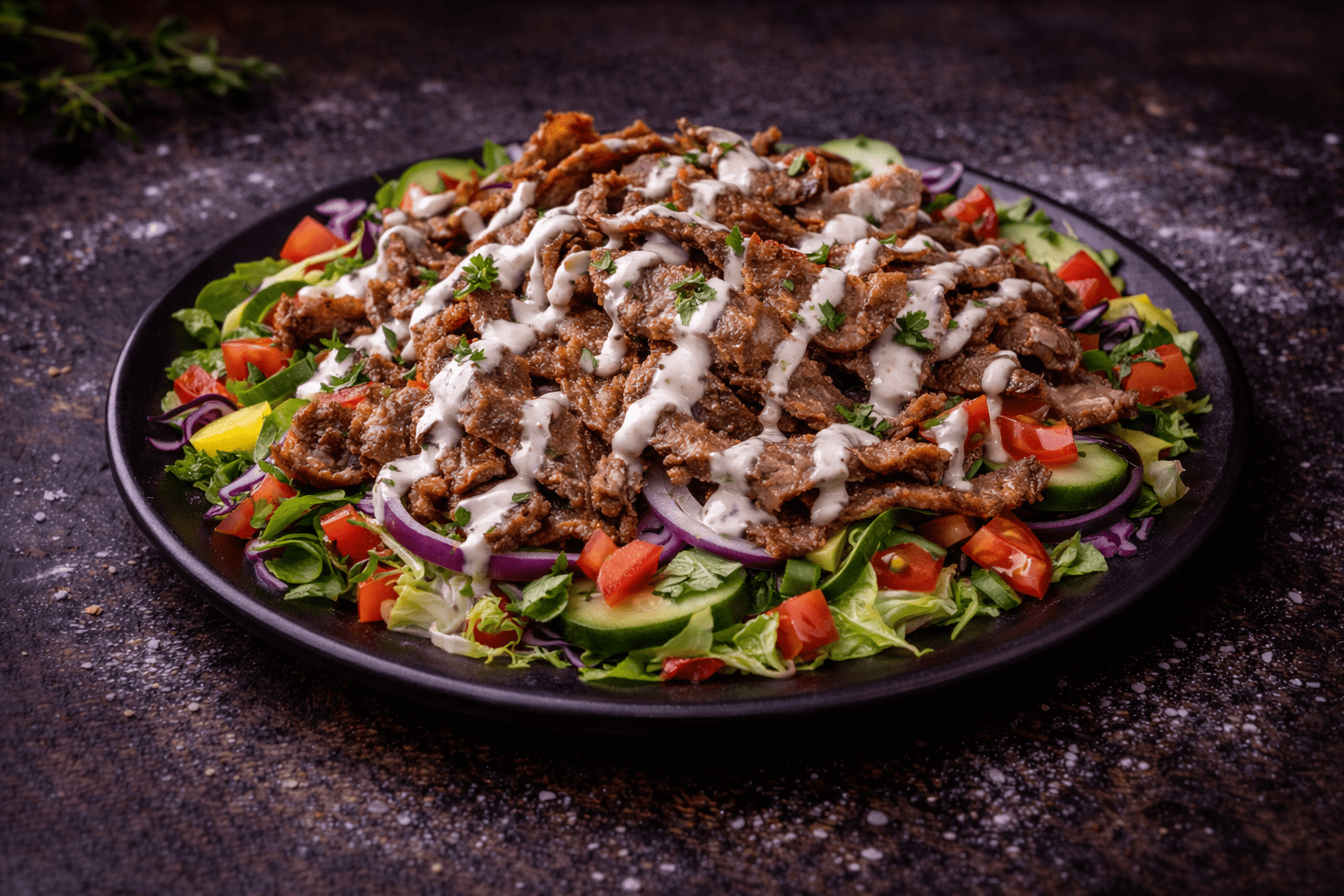 A fresh and satisfying dish featuring tender slices of seasoned kebab meat served on a bed of crisp lettuce, tomatoes, and fresh vegetables. The juicy kebab adds rich flavor while the vegetables bring freshness and texture. Finished with a delicious house dressing, this dish offers a light yet filling meal perfect for kebab lovers.