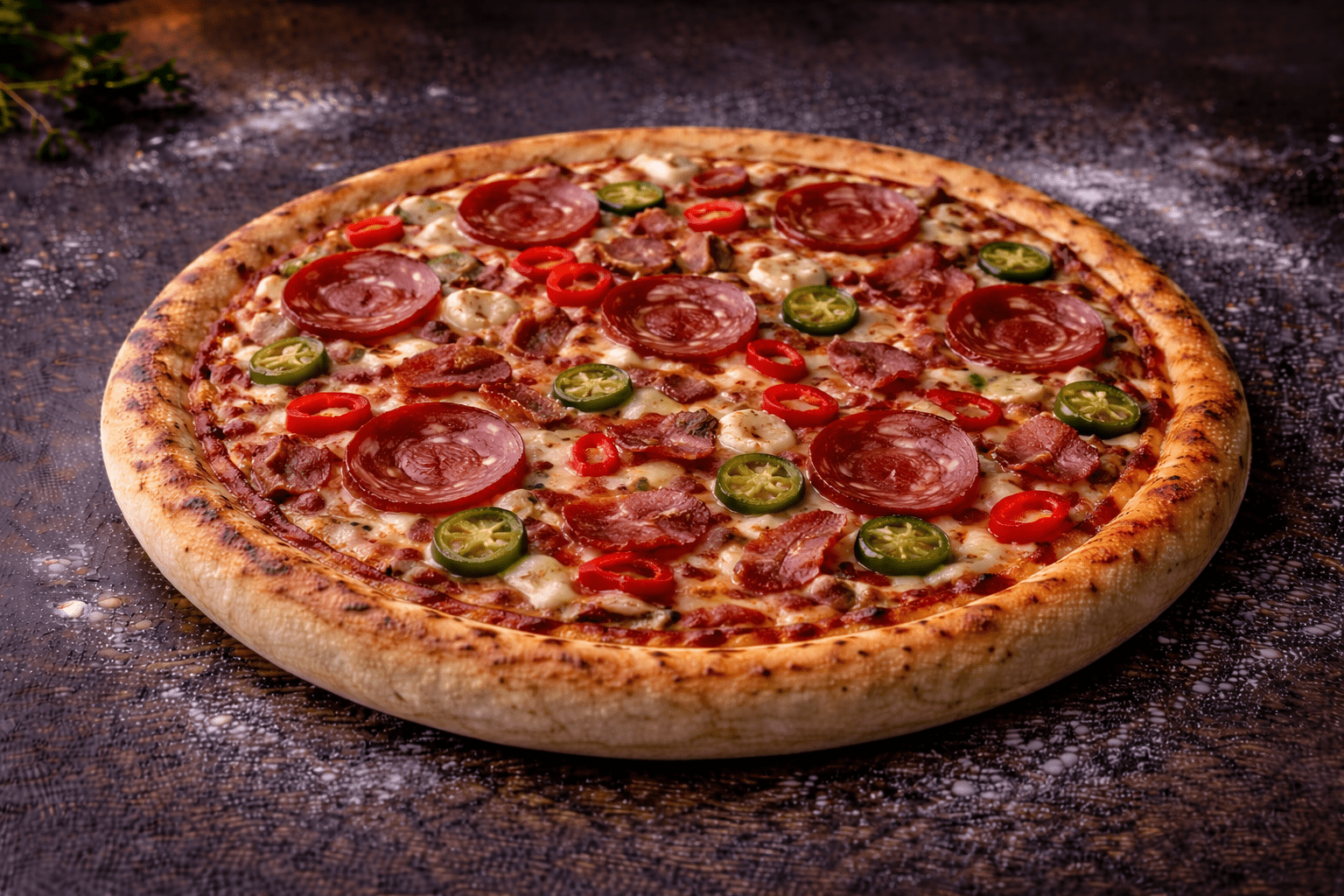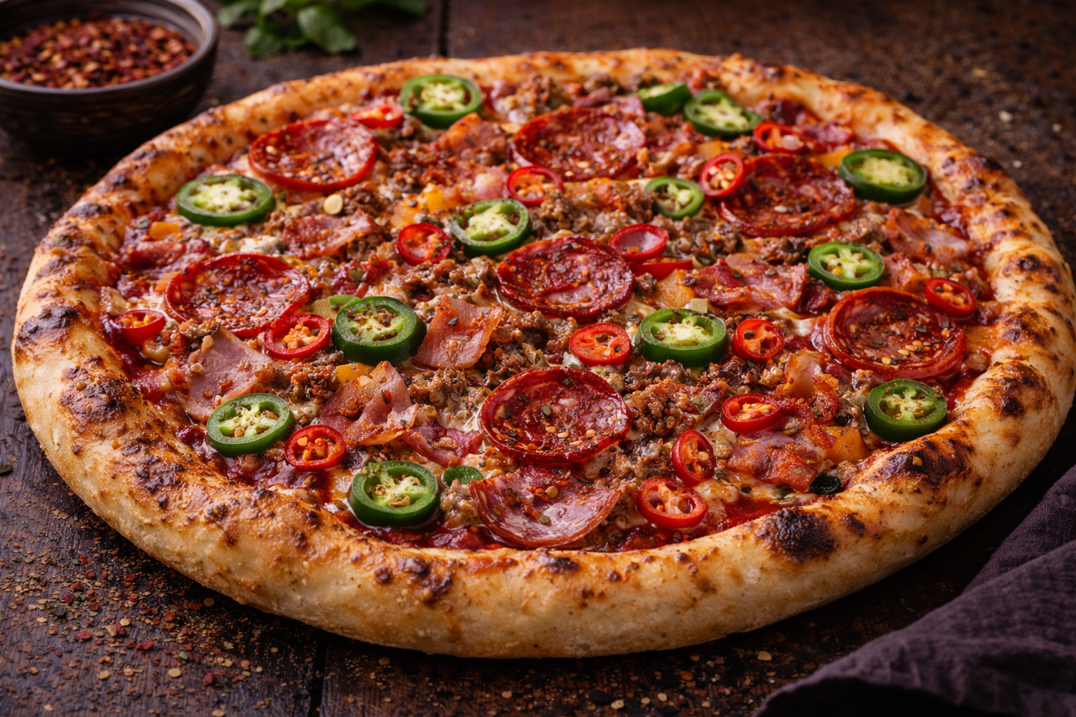 A fiery pizza topped with taco sauce, pepperoni, chili, bacon, and jalapeños. The combination of spicy and smoky ingredients creates an intense flavor experience. With melted cheese and tomato sauce, this pizza is perfect for spice lovers.