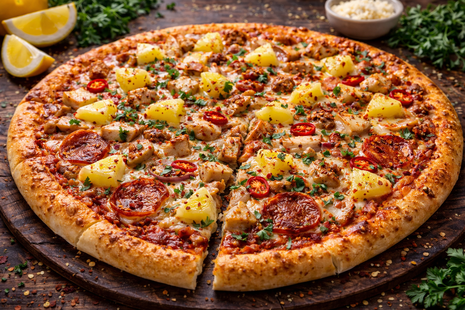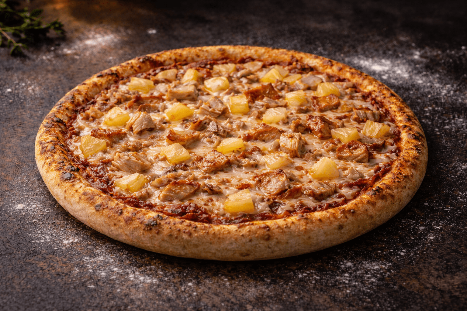 A delicious chicken pizza topped with tender chicken pieces and sweet pineapple. The combination creates a unique mix of savory and sweet flavors. Paired with melted cheese and tomato sauce, this pizza is light yet satisfying, making it a great choice for those who enjoy chicken-based pizzas.