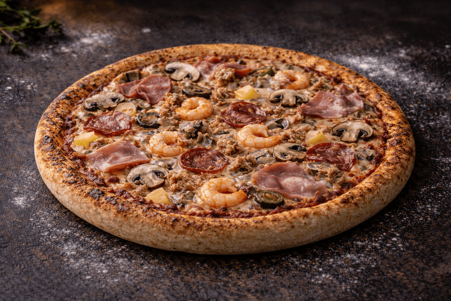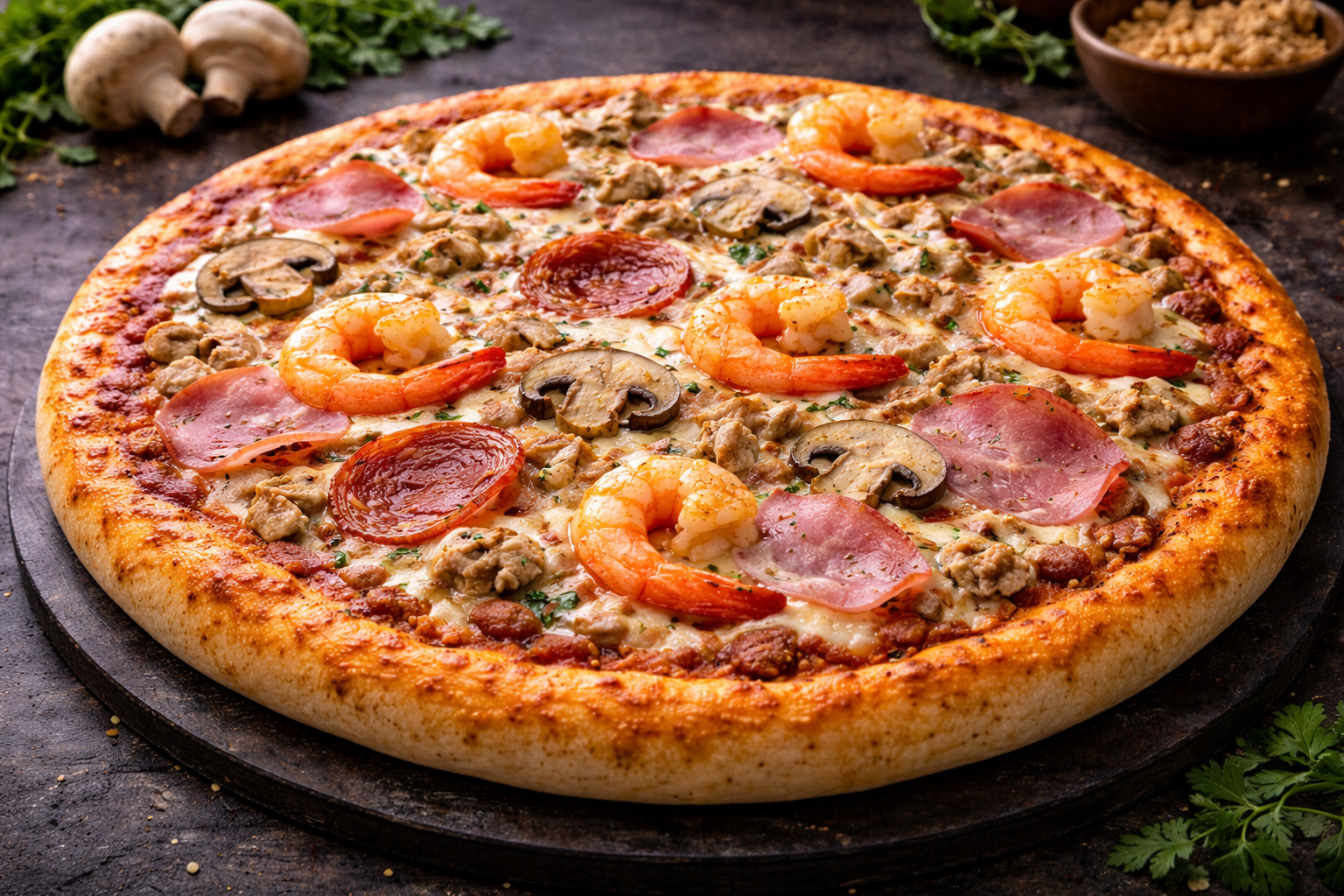 A rich and varied pizza topped with ham, mushrooms, tuna, and shrimp. The combination of land and sea ingredients creates a flavorful and unique taste. With melted cheese and tomato sauce on a crispy crust, this pizza is perfect for those who love diverse toppings.