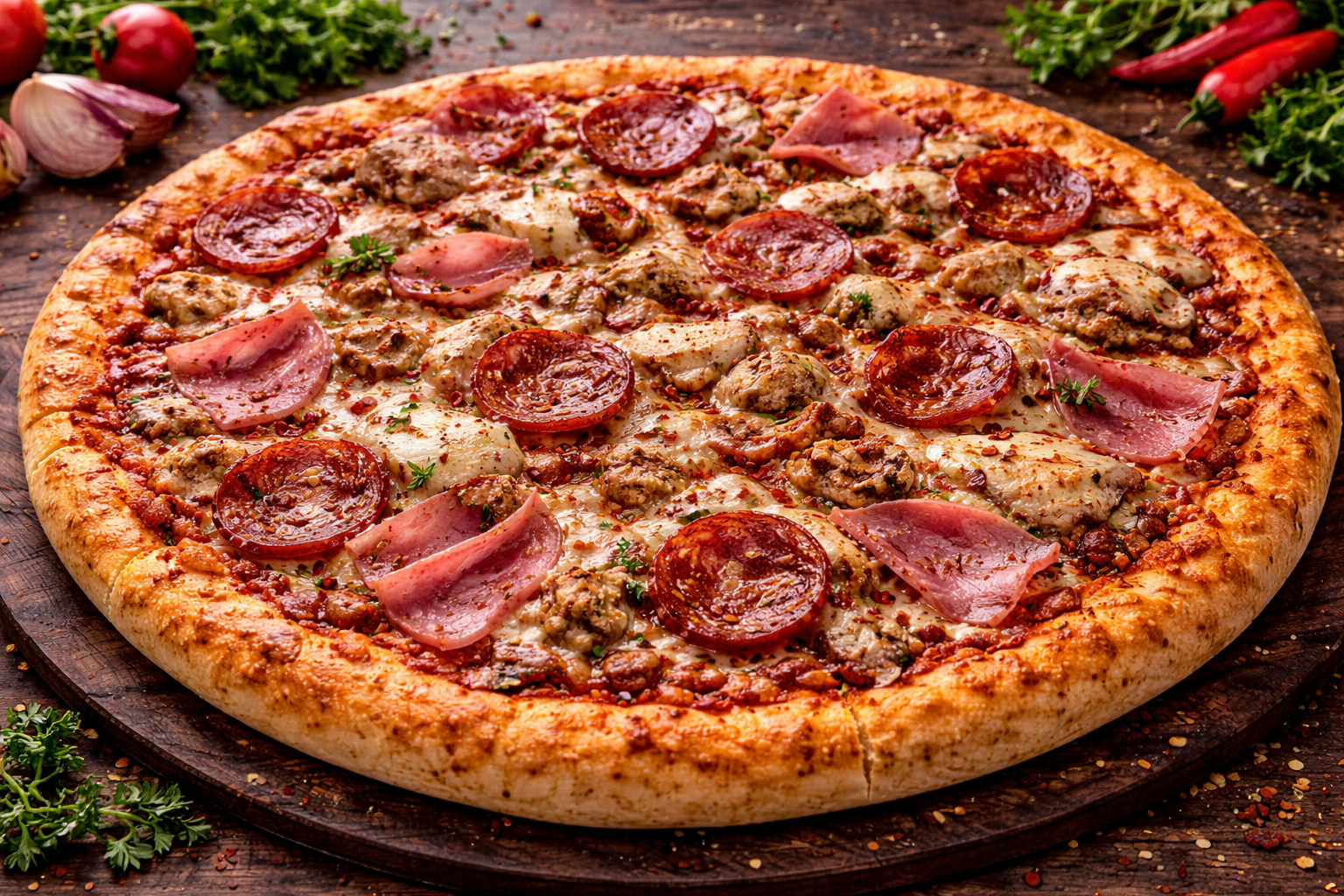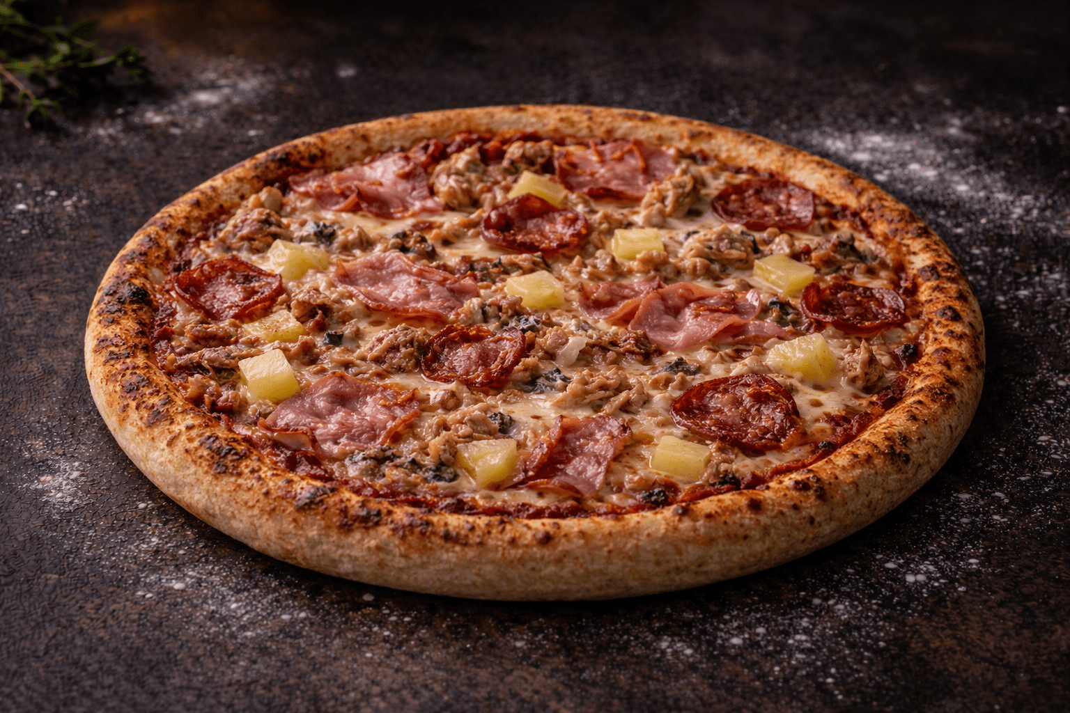 A richer version of the Opera pizza featuring ham, tuna, and salami. The combination of meats and tuna adds layers of flavor, making each bite bold and satisfying. Melted cheese and tomato sauce bring everything together on a crispy crust for a hearty and delicious meal.